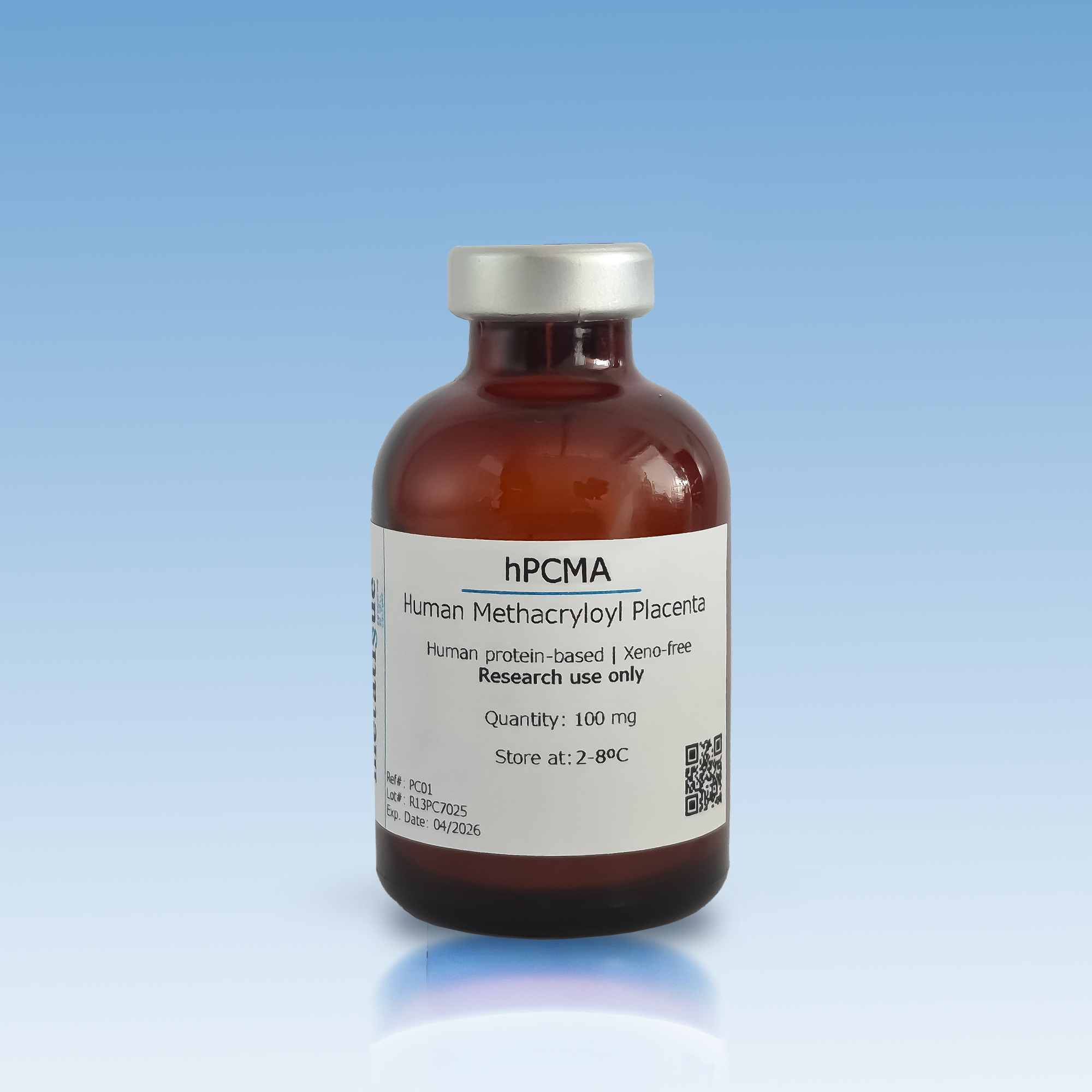 hPCMA Photopolymerizable hydrogel is a human based, bioactive placenta-based platform that provides physiologically relevant microenvironments for cells culture. The precursor solution is easily prepared by reconstituting hPCMA lyophilizate in an aqueous solution with a photoinitiator. Afterwards, it can be cured upon light exposure to form a hydrogel with tuneable mechanical properties. hPCMA hydrogels provide great control over gelation time and matrix stiffness, enabling researchers to create the cell culture environment that better fits their needs.